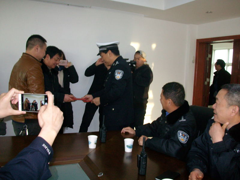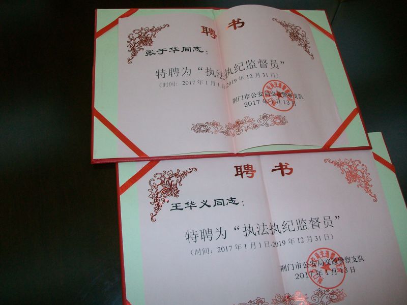 交警在對他們進(jìn)行獎勵外,并給他們頒發(fā)了荊門交警支隊(duì)執(zhí)法執(zhí)紀(jì)監(jiān)督員聘書。