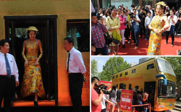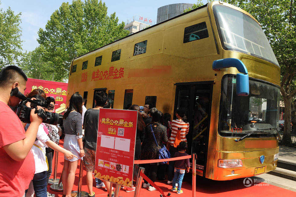 4月25日,一輛“黃金公交車(chē)”亮相山東濟(jì)南。據(jù)介紹,該公交車(chē)80%的部分都貼了金箔,“黃金美女”模特身上佩戴的黃金飾品價(jià)值兩百萬(wàn),公交車(chē)車(chē)內(nèi)掛滿了數(shù)千件黃金飾品,重達(dá)幾十公斤,總共價(jià)值500余萬(wàn)。(來(lái)源:騰訊新聞 陳寧/CFP)