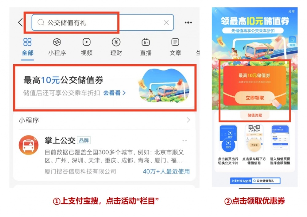 如何領取【儲值立減券】:活動期間,上支付寶搜索【公交儲值有禮】或掃描下方二維碼,進入活動頁面,點擊“立即領取“,即可免費領取公交儲值優(yōu)惠。