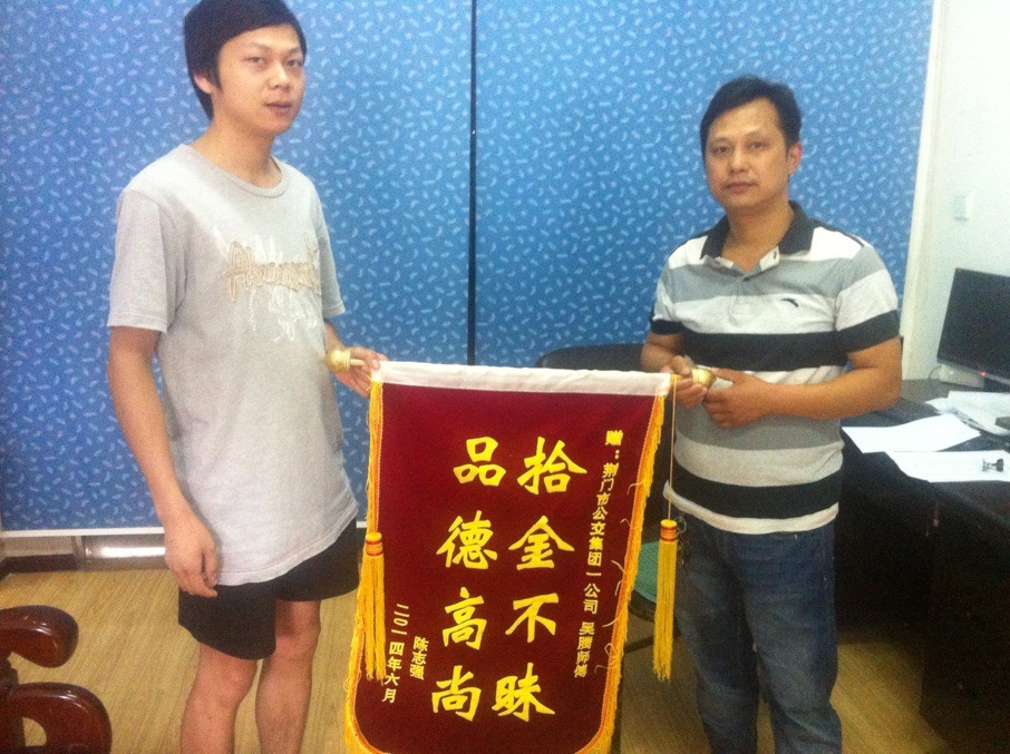 原來,15日下午2時許,1路公交車司機(jī)吳騰驅(qū)車途經(jīng)城區(qū)長寧大道長寧8號廣場(中百倉儲)公交站點時,在馬路中央撿到一個黑色皮包,并及時上交到公交集團(tuán)公汽一公司。公司負(fù)責(zé)人將皮包內(nèi)身份證信息通過《荊門晚報》及荊門社區(qū)網(wǎng)絡(luò)媒體發(fā)布尋找失主陳先生信息,陳先生看到招領(lǐng)信息后,很快得知錢包的下落了,他說這(找回錢包)是他萬萬沒想到的。18日上午,陳先生順利地從公汽一公司負(fù)責(zé)人手中認(rèn)領(lǐng)到丟失的錢包,并特意為吳師傅制作了一面"拾金不昧 品德高尚"錦旗表示謝意。