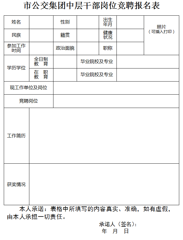 2.報名方式為現(xiàn)場、網(wǎng)上兩種方式。可登陸荊門市公共交通集團有限公司網(wǎng)站,下載《市公交集團中層干部崗位競聘報名表》并填寫,